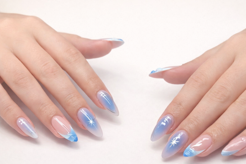 One of the newest evolutions of the blue French manicure is the glass-effect aura style. Ultra-thin sky blue nail tips combined with a soft aura fade underneath create a layered, almost translucent look.