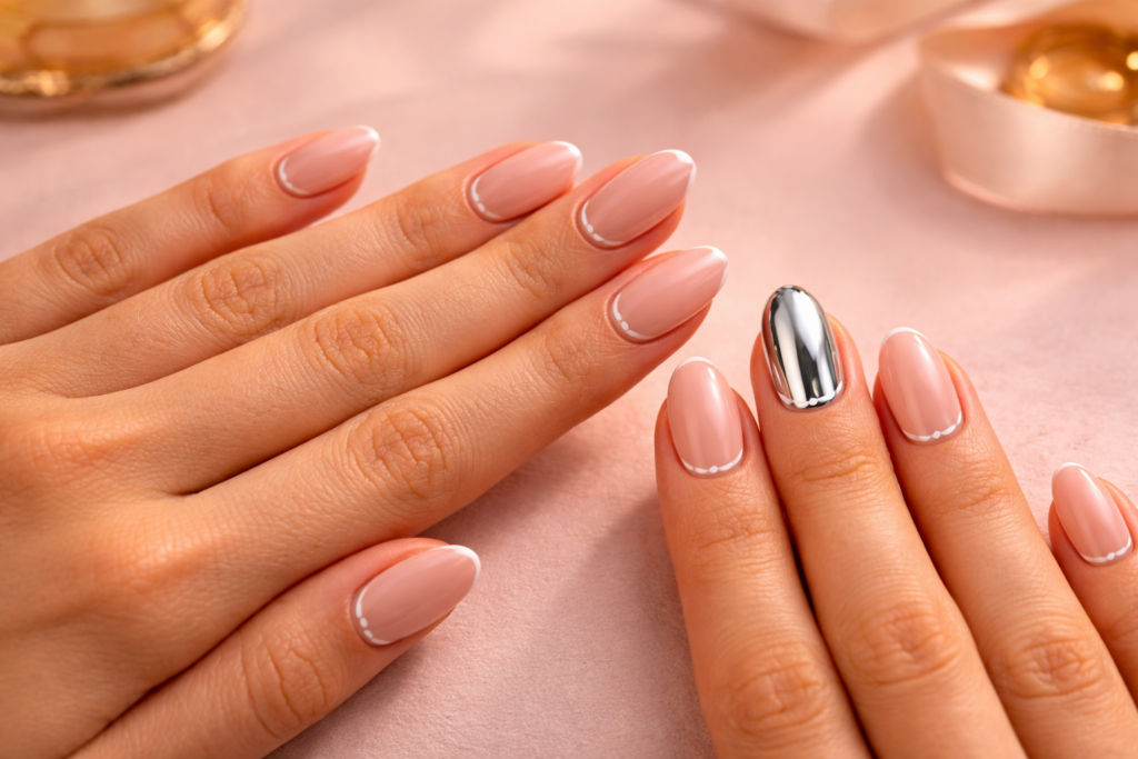 Shrink your french tip to just two millimeters at the very edge of your nail. Keep it on nine fingers. Make your ring finger full chrome. The contrast between minimal and maximal on the same hand creates tension that reads as intentionally styled rather than confused. Use the thinnest brush you own and brace your painting hand against the table for control.