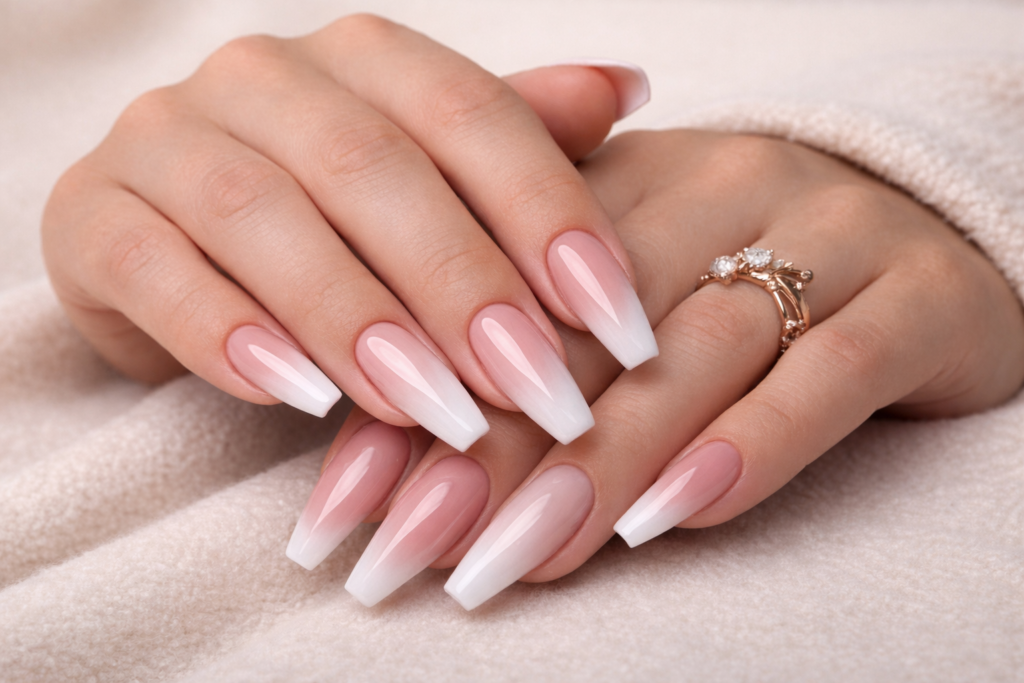 French ombré remains one of the most requested looks. Instead of a harsh white line, the gradient softly fades from nude to milky white, creating a timeless bridal aesthetic.