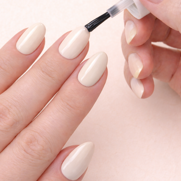 Glossy finishes help nude nails look smooth and intentional. Many rely on a simple top coat like this as the glossy top coat used to finish nude nails, especially for soap-nail and clean-girl looks.