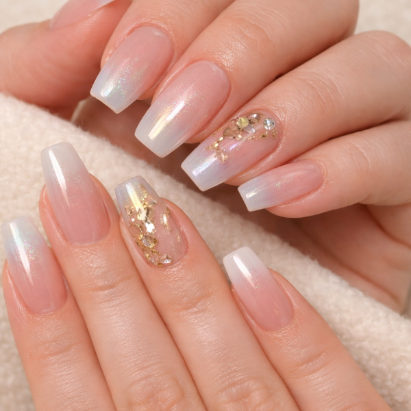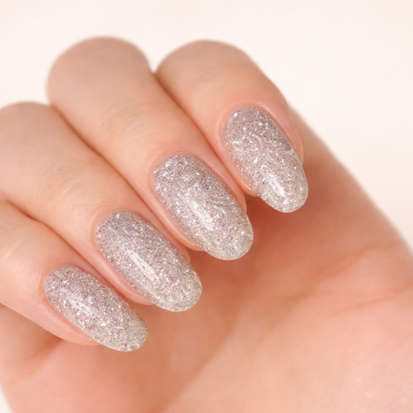 Glittery dip powders or accent nails bring the light and fun atmosphere in a quiet manner.