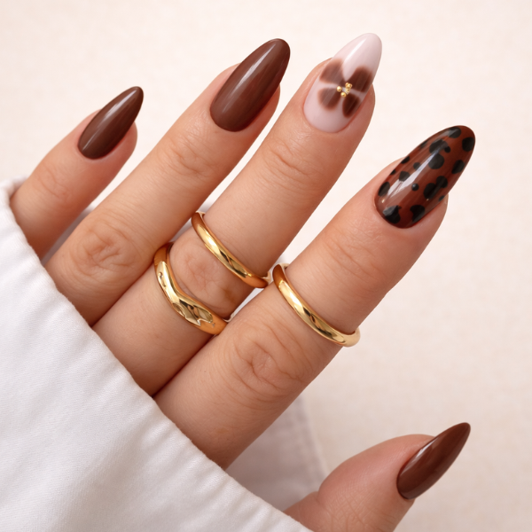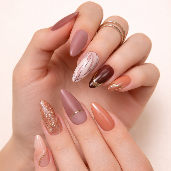To achieve a warm, textured fall look like this, I used a fall gel nail polish set to layer deep seasonal tones with a smooth, long-lasting finish—ideal if you want to recreate a similar look at home.