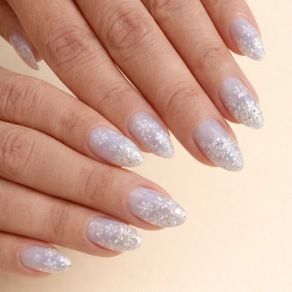 • To get a snowfall nail design, first select a soft, frosty blue or white base and then cover it with glitter to create a winter wonderland effect.
