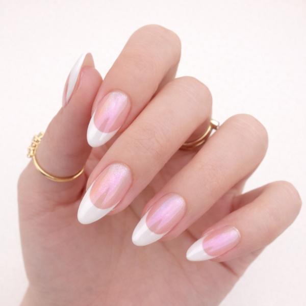 That reflective, glazed finish on long French tips is usually created with Shiny chrome powder, lightly layered over gel to enhance shine without overpowering the design.