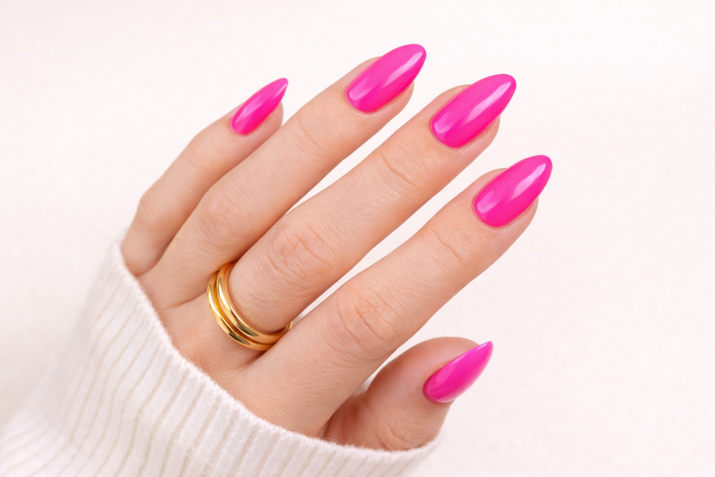 A cheerful neon pink that screams playful and trendy — perfect for vacation vibes, festivals, or a statement mani you’ll love showing off.