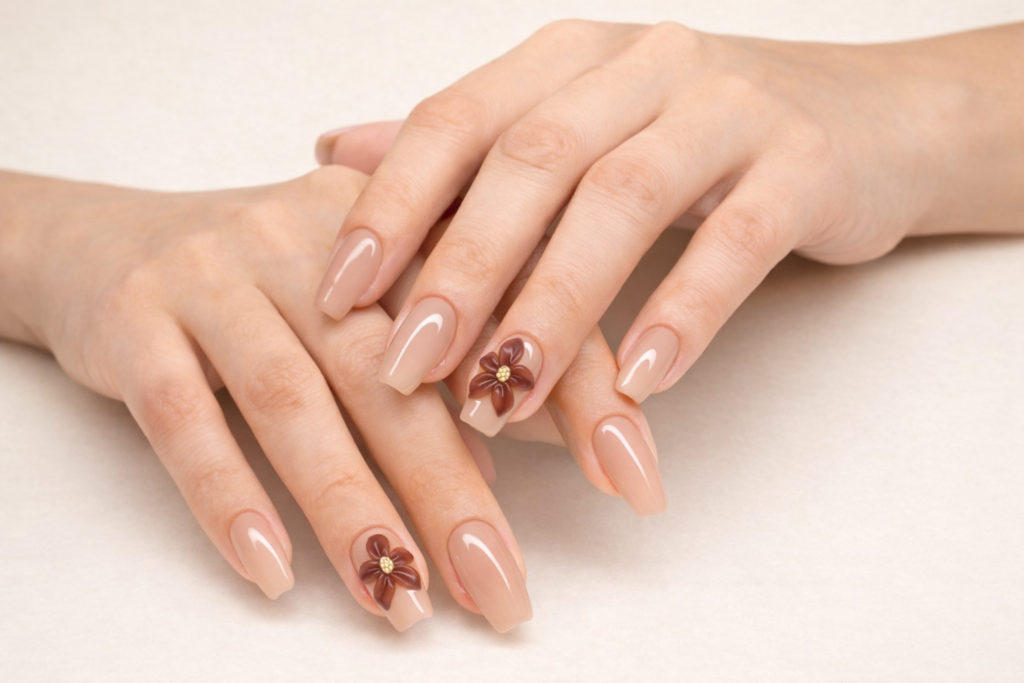 A soft nude base with 3D flower details just gives that clean, delicate nail look. It feels simple at first, but the little flowers make it stand out.