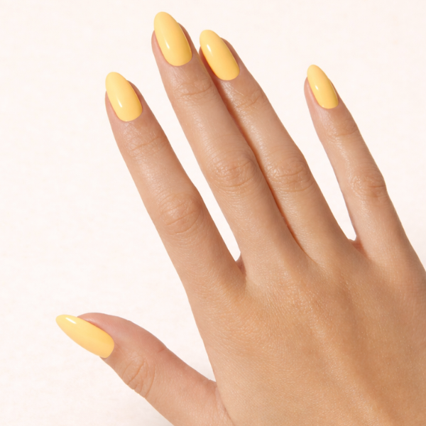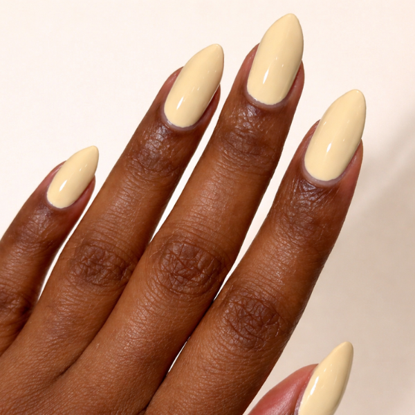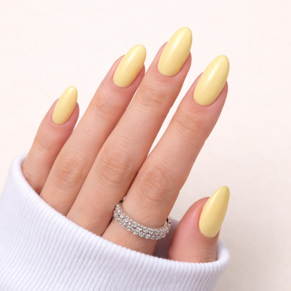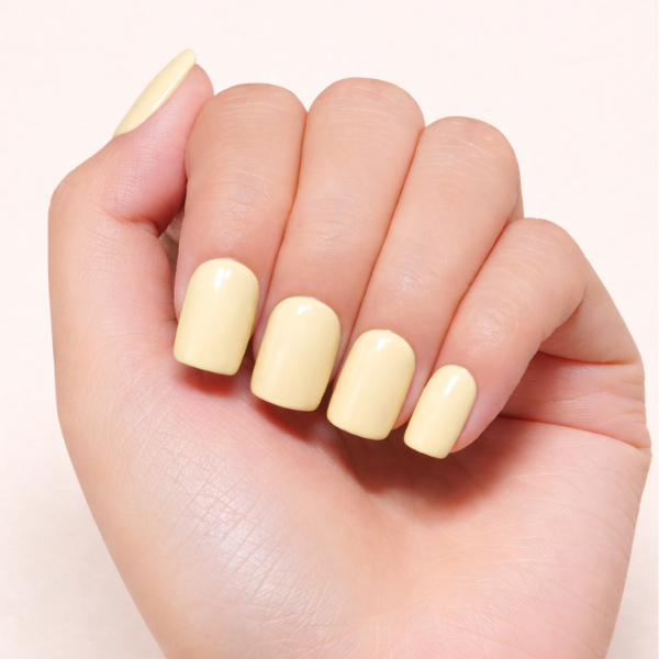Soft pastel looks like this are usually created with a creamy formula such as Butter Yellow Gel Nail Polish, the butter yellow shade used here, which gives an even, milky finish without looking chalky.